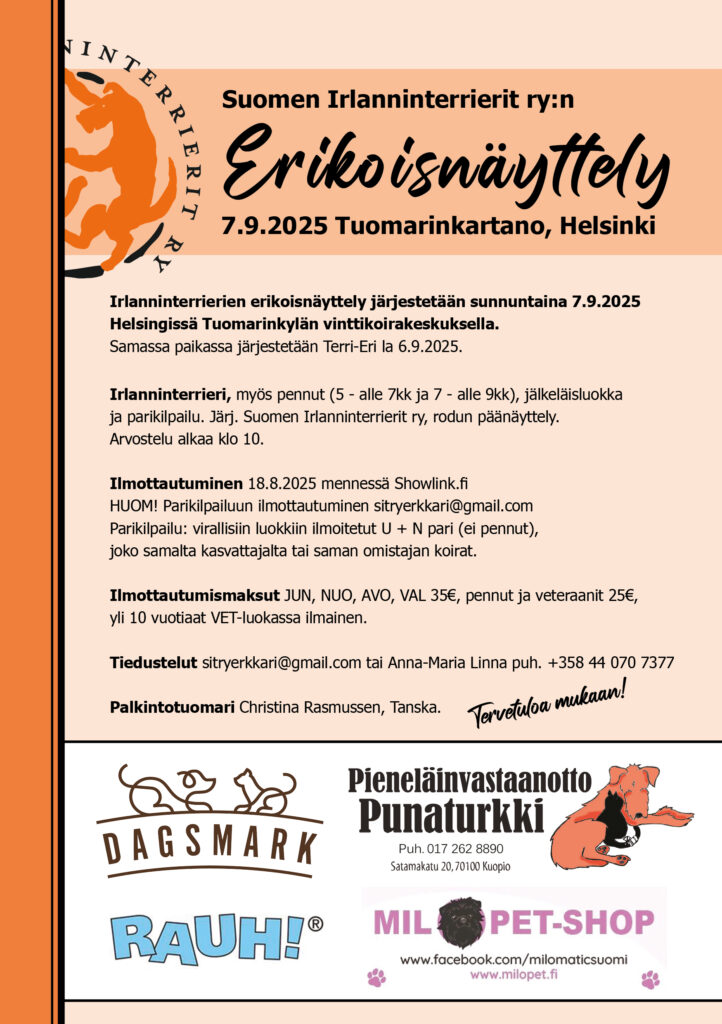 Irlanninterrierien erikoisnäyttely järjestetään sunnuntaina 7.9.2025 Helsingissä Tuomarinkylän vinttikoirakeskuksella. Samassa paikassa järjestetään Terri-Eri la 6.9.2025.